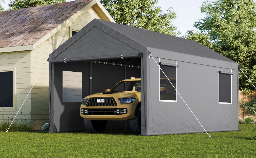 SANWAY 10'x20' Heavy Duty Carport with Removable Sidewalls & Doors, Portable Garage with Roll-up Ventilated Windows, Beige